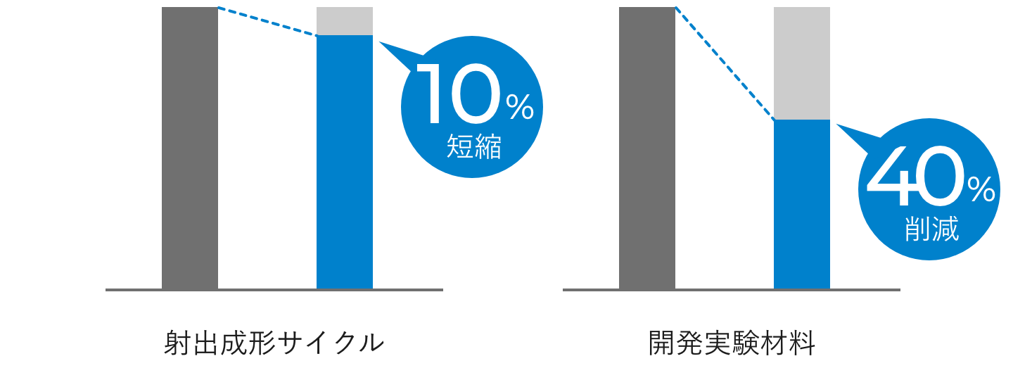 全体の結果:射出成形サイクルを10%短縮、開発実験材料を40%削減