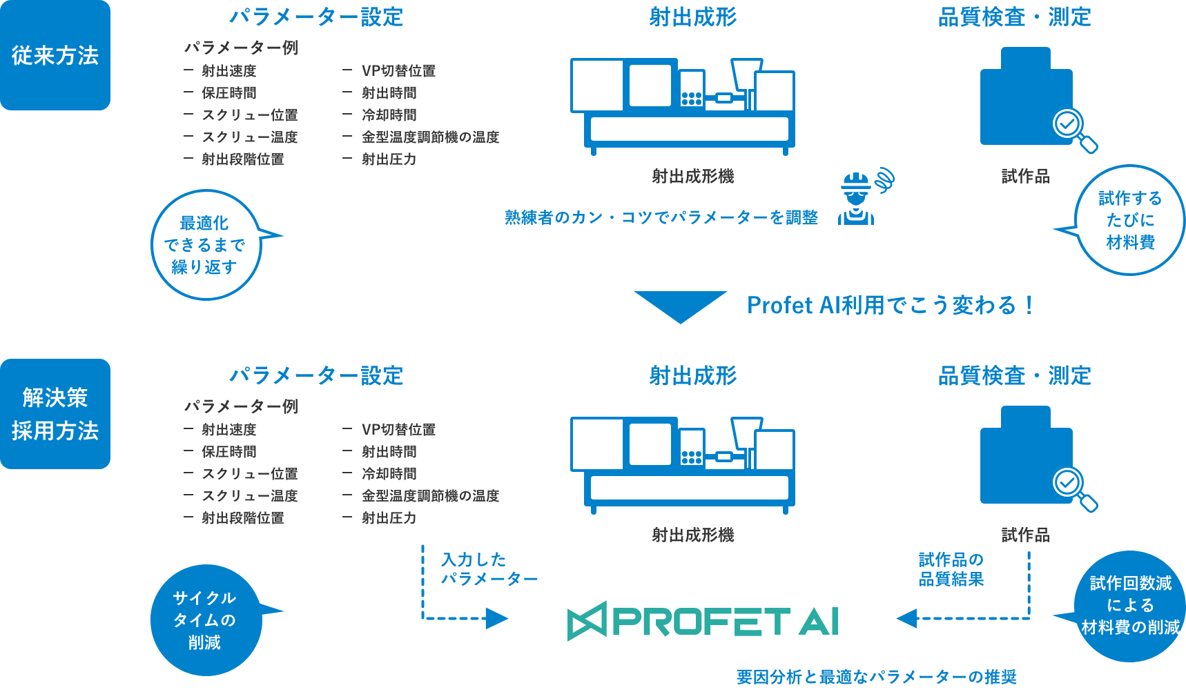「生産スピードを早めたい一方で、品質は落としたくない」というニーズがあったA社。射出成形は、パラメーターが多く、担当者の経験に頼って試作を何度も繰り返すため、時間も材料コストもかさんでいました。そこでA社は「Profet AI」を導入。AIが過去データをもとに最適なパラメーターの組み合わせを予測することで、条件設定のプロセスを大幅に効率化しました。その結果、成形サイクルは10%短縮され、開発時の材料使用量も40%削減することに成功しました。